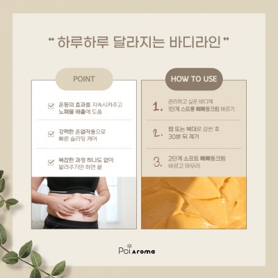 각종 아로마 오일 성분과 말채나무 성분을 함유하고 있는 바디라인의 셀룰라이트를 정리하기 위한 발열 크림